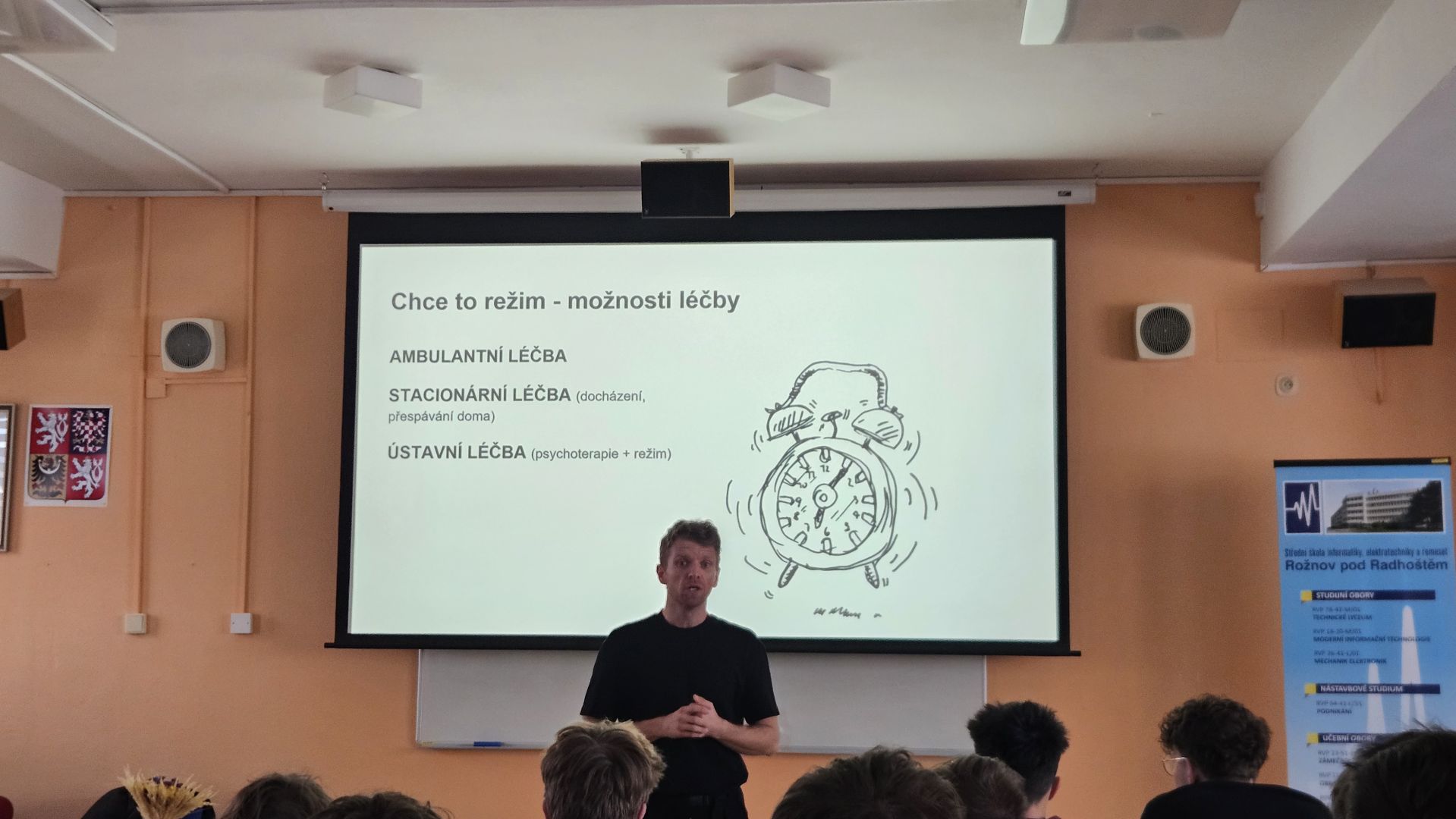 Přednáška nabídla otevřený a autentický pohled na problematiku alkoholu, jeho vliv na zdraví i každodenní život, založený nejen na faktech, ale i na vlastní životní zkušenosti. Přednášející bez moralizování mluvil o tom, jak snadno se může alkohol stát problémem, jak ovlivňuje rozhodování, vztahy i budoucnost člověka. Přednáška byla postavená na konkrétním příběhu a aktivní diskusi, do které se studenti přirozeně zapojovali. Právě osobní rovina a civilní způsob podání dodaly tématu na síle a srozumitelnosti.