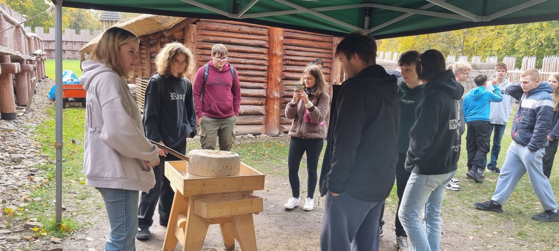 Slovanské hradiště, které se rozkládá na ostrohu nad řekou Olší, bylo osídleno už v době pravěku. Období největší slávy zažívalo v době od 9. do poloviny 11. století, kdy jeho obyvatelé ze strategicky skvěle umístěného sídla kontrolovali důležité obchodní stezky z jihu na sever a na východ. Byli výbornými řemeslníky – o tom jsme se přesvědčili v příbytcích tkalce, hrnčíře i výrobce zbraní – a své výrobky čile směňovali s putujícími obchodníky. Zjistili jsme, že jejich život zcela jistě nebyl jednoduchý. A to jsme si vyzkoušeli jen zlomek z toho, co obnášel jejich život. Někteří z nás otestovali, jak se mlelo obilí mezi dvěma kameny. Namlít kilo mouky se rovnalo přibližně půl hodině usilovné práce. Odvážní muži naší výpravy otestovali slovanské zbraně, další účastníci si vyzkoušeli, jak se psalo na voskové tabulky, a to i hlaholicí.