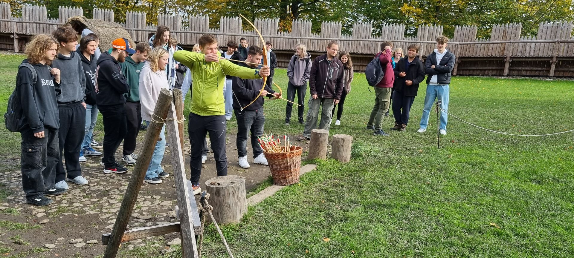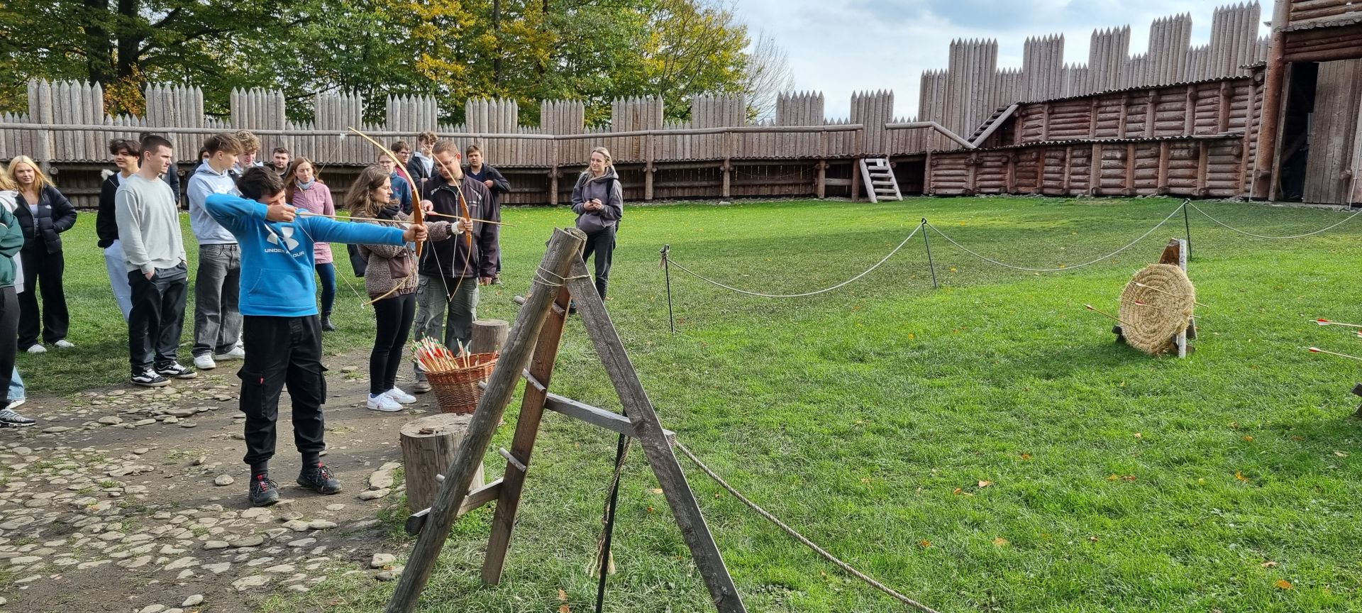 Průzkum sídliště Slovanů jsme ukončili nácvikem střelby šípy na slaměné terče. Byli jsme překvapeni, že zvládnout luk není vůbec jednoduché. Výsledek našeho bádání v terénu byl jednoznačný – naši předkové byli borci, že v takových podmínkách dokázali všechno, co potřebovali k životu, vlastnoručně vyrobit, vypěstovat a ještě zajistit obranu svých příbytků.