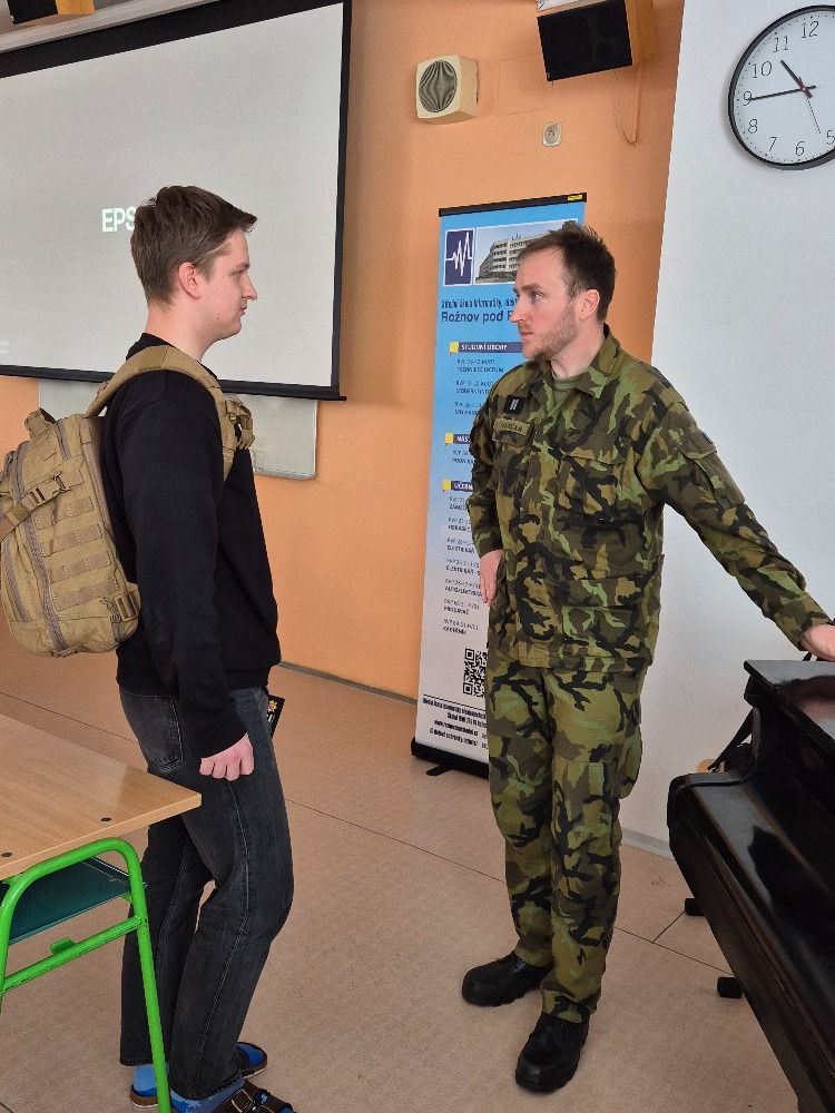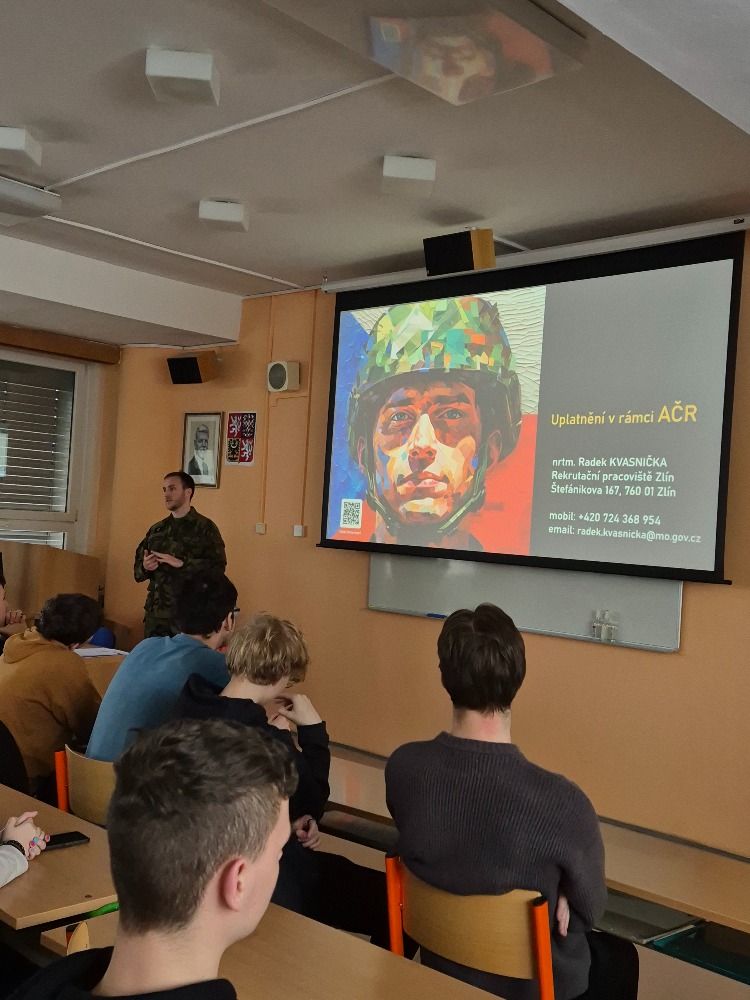 Rovněž jsme kvitovali prezentaci zástupce Armády ČR, který nabídl našim budoucím absolventům ucelený přehled možností studia na vojenských VŠ či cestu, jak se moci zapojit do aktivní zálohy naší armády.