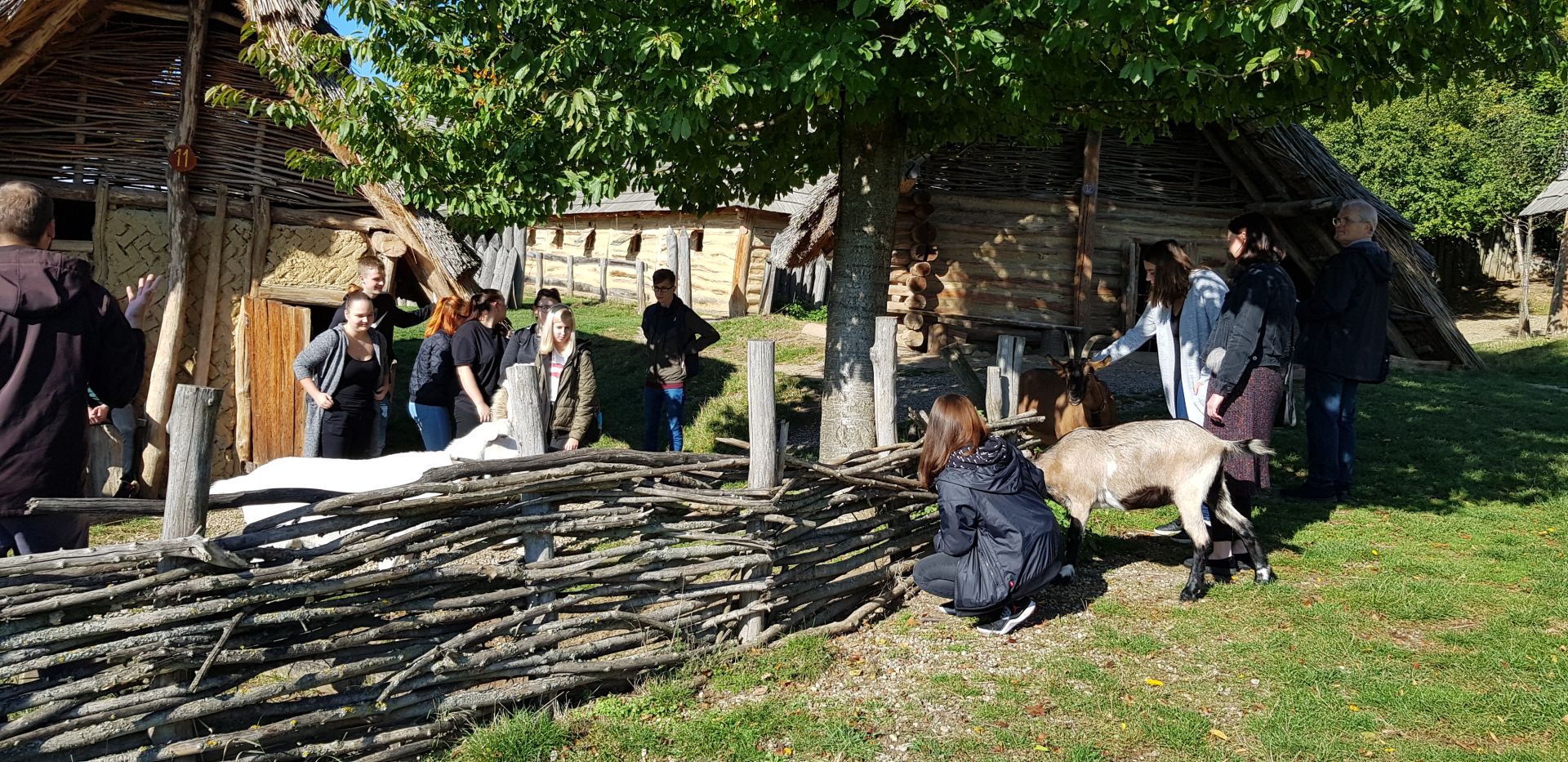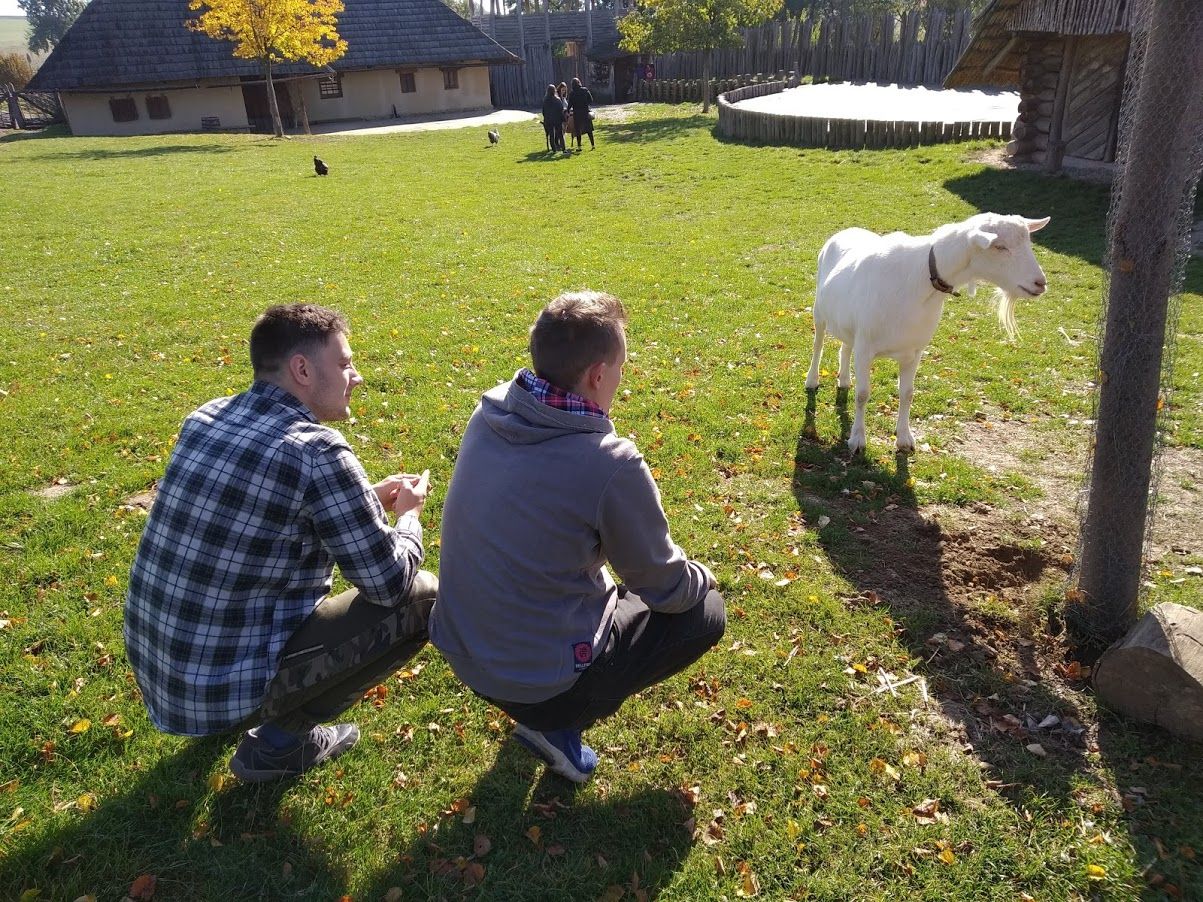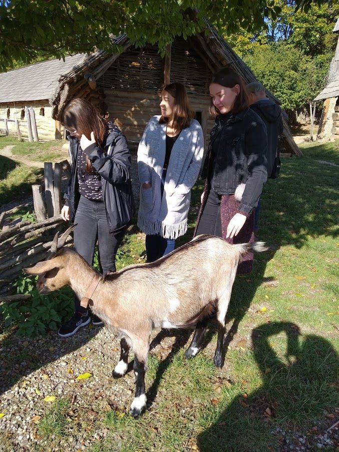 V závěru prohlídky nás čekal knížecí palác a obydlí řemeslníků s ukázkami jejich výrobků. Před opuštěním areálu se s námi rozloučilo početné domácí zvířectvo, jehož vyslanci v pohodě koz nás celou dobu provázeli a dostávalo se jim četných projevů přízně z řad našich studentů.