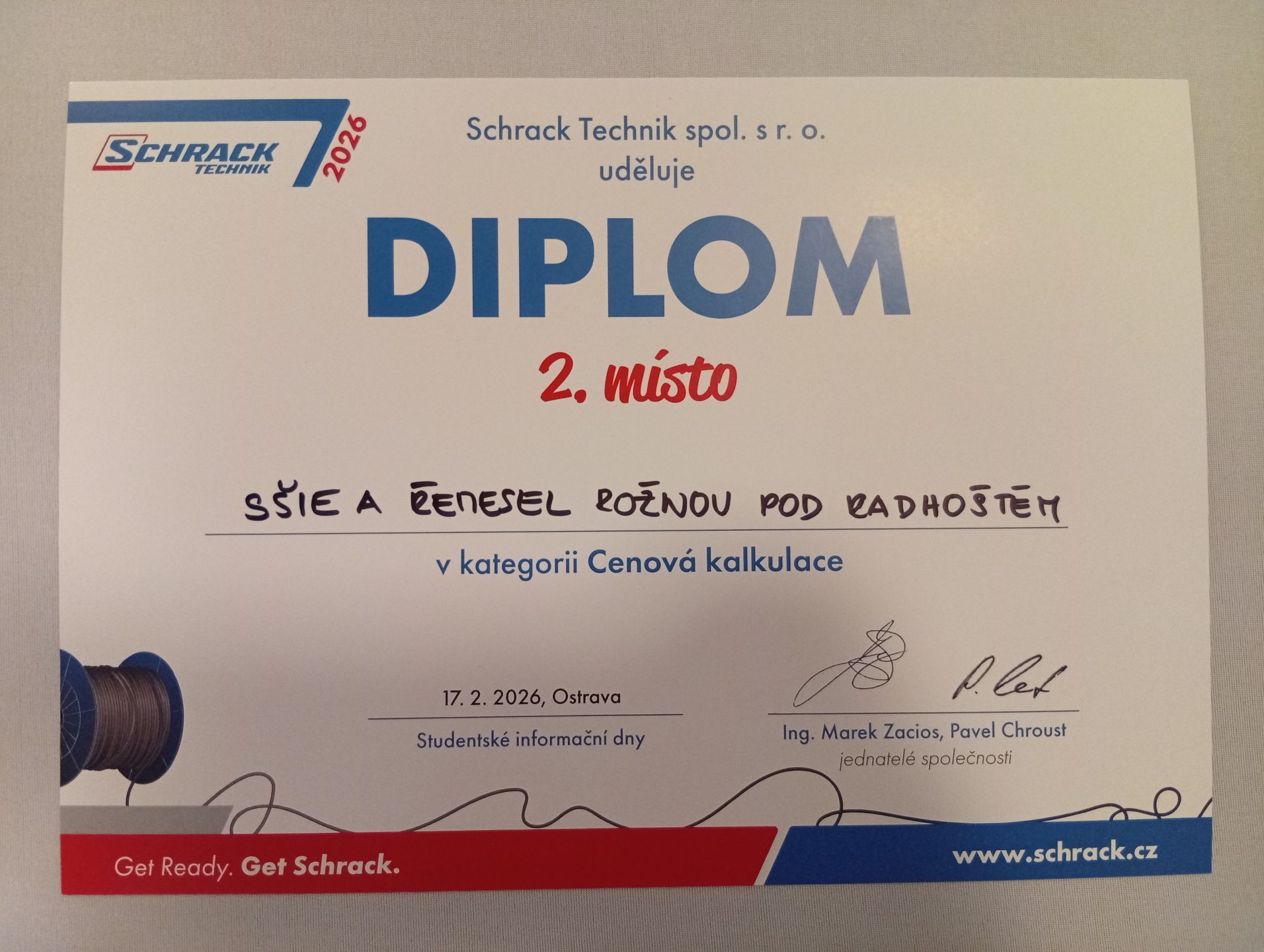 V konkurenci 13-ti týmů se naši žáci umístili na druhém místě v kategorii "Cenová kalkulace". V individuální soutěži v návrhu rozvaděče v programu "Schrack design", kde soutěžilo 130 žáků z různých škol, se náš žák Daniel Švec umístil rovněž na druhém místě. Všem zúčastněným gratulujeme.