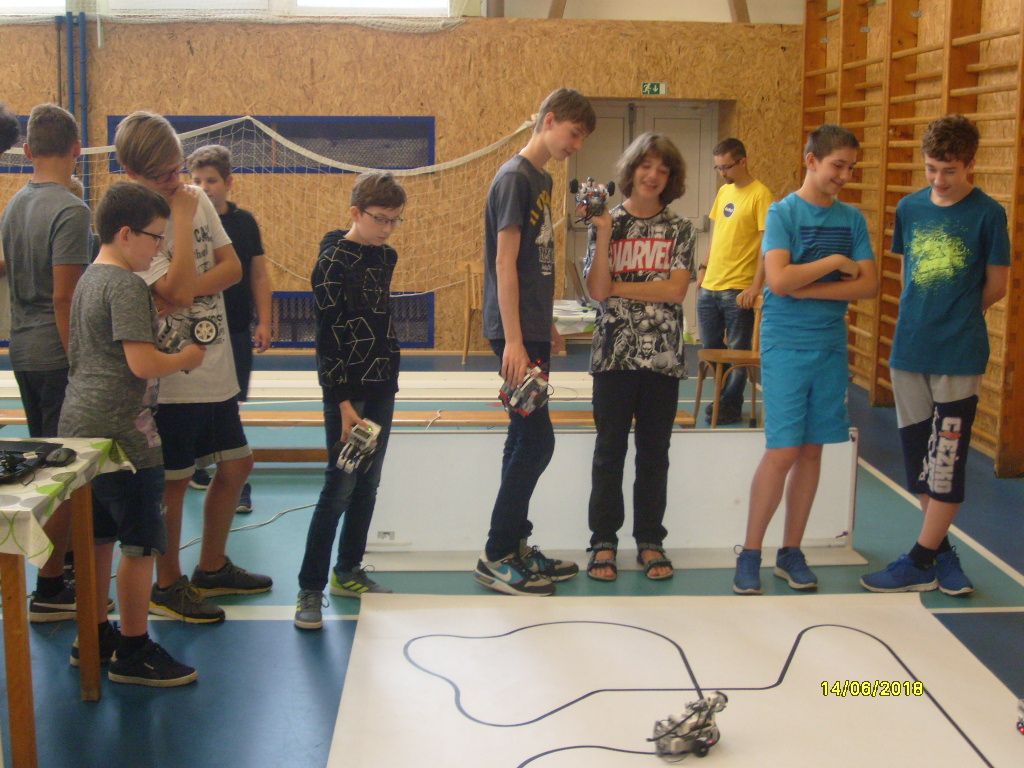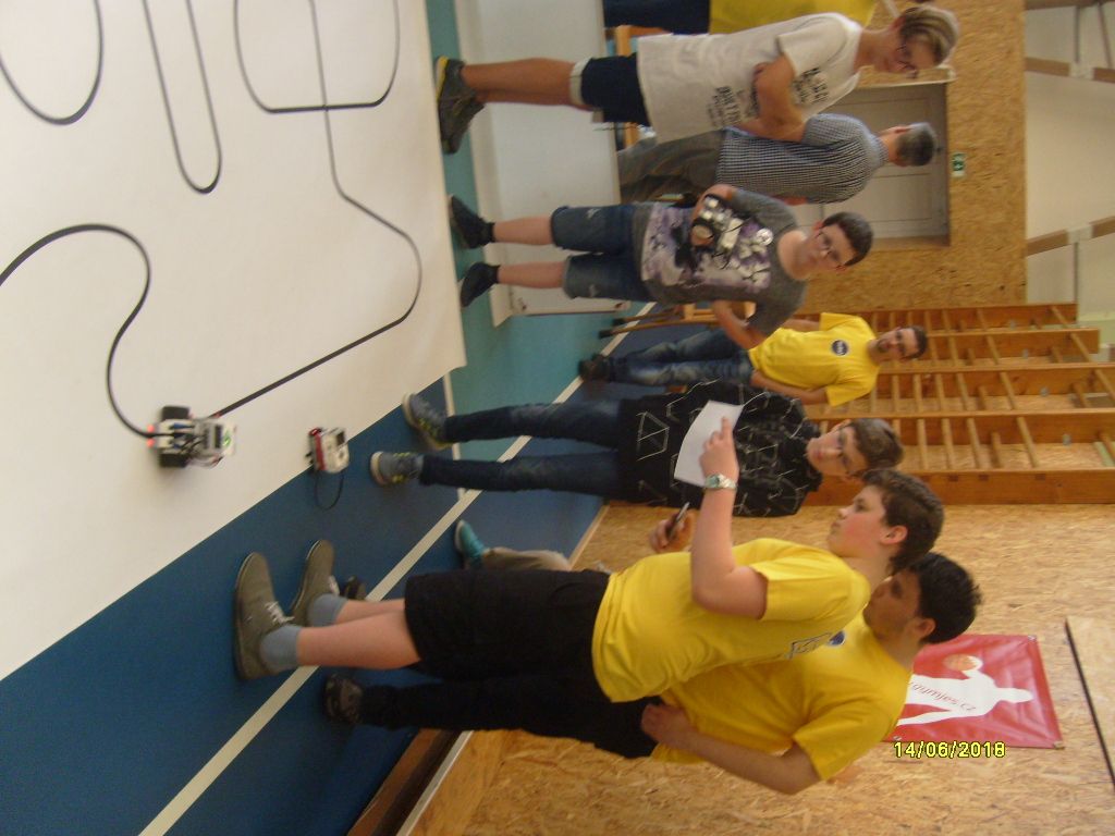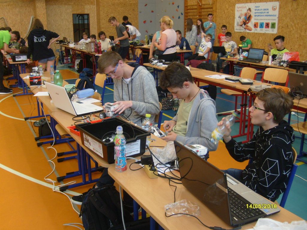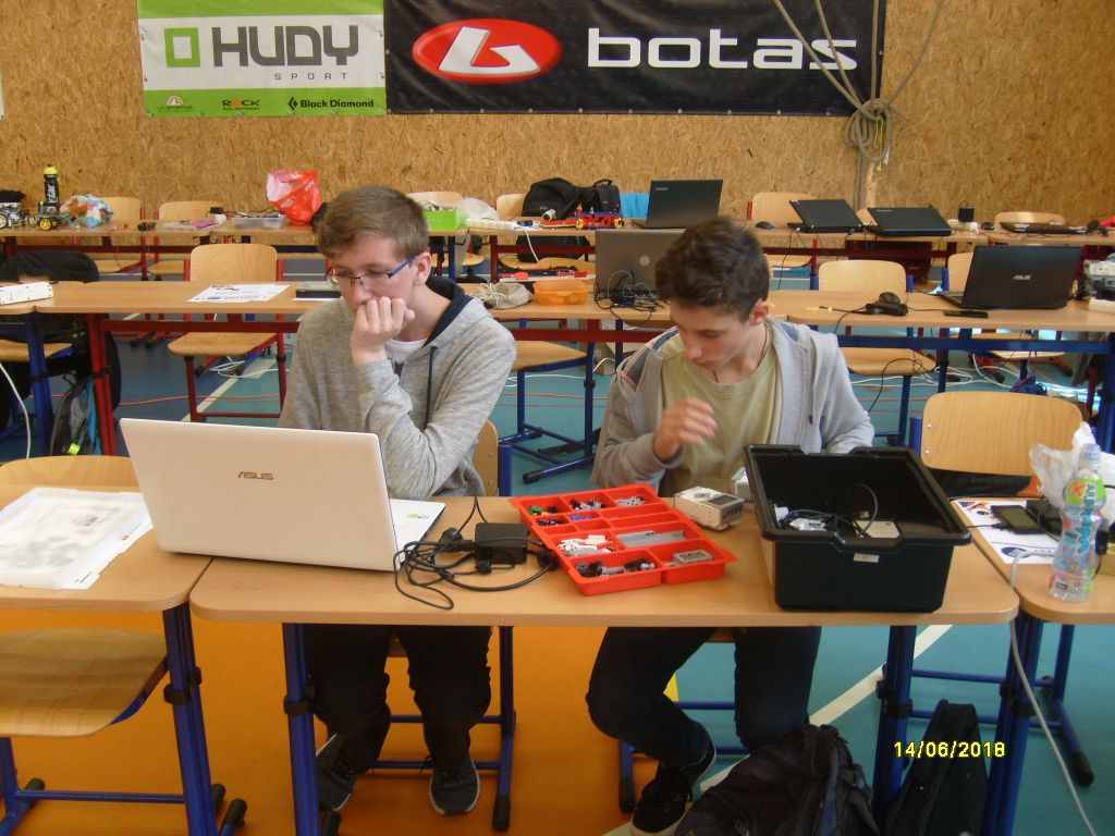 Tradiční soutěž robotů v Jeseníku se konala 15. 6. 2018 v tělocvičně místního gymnázia. Letos náš kroužek reprezentovali dva žáci ZŠ Tomáš Macura a nováček Adam Kročák a zkušený středoškolák Martin Procházka.