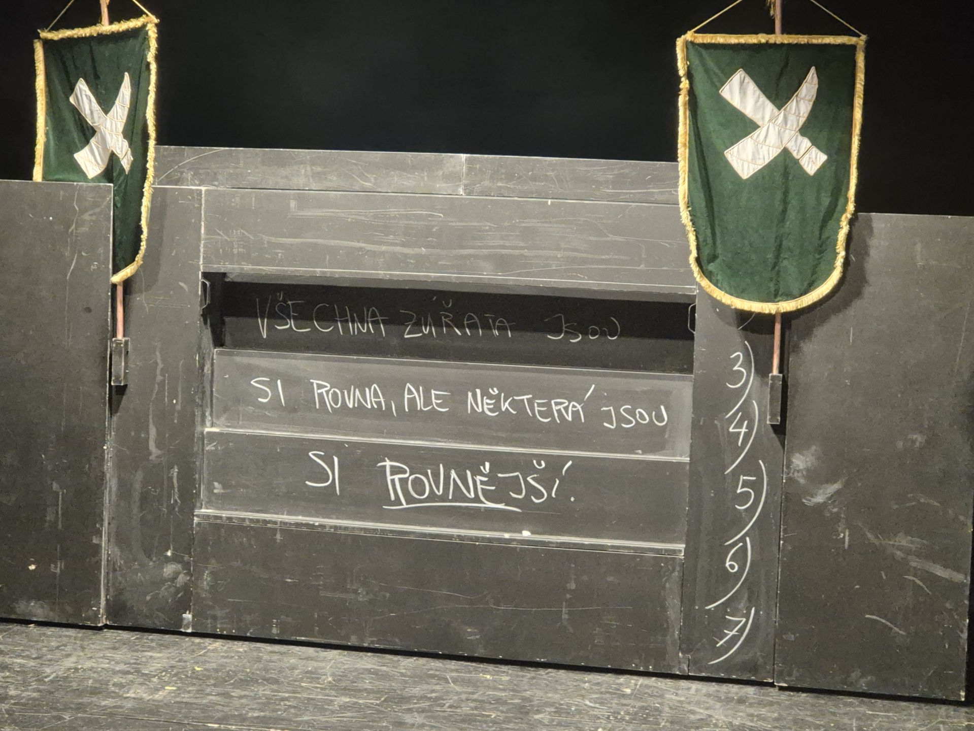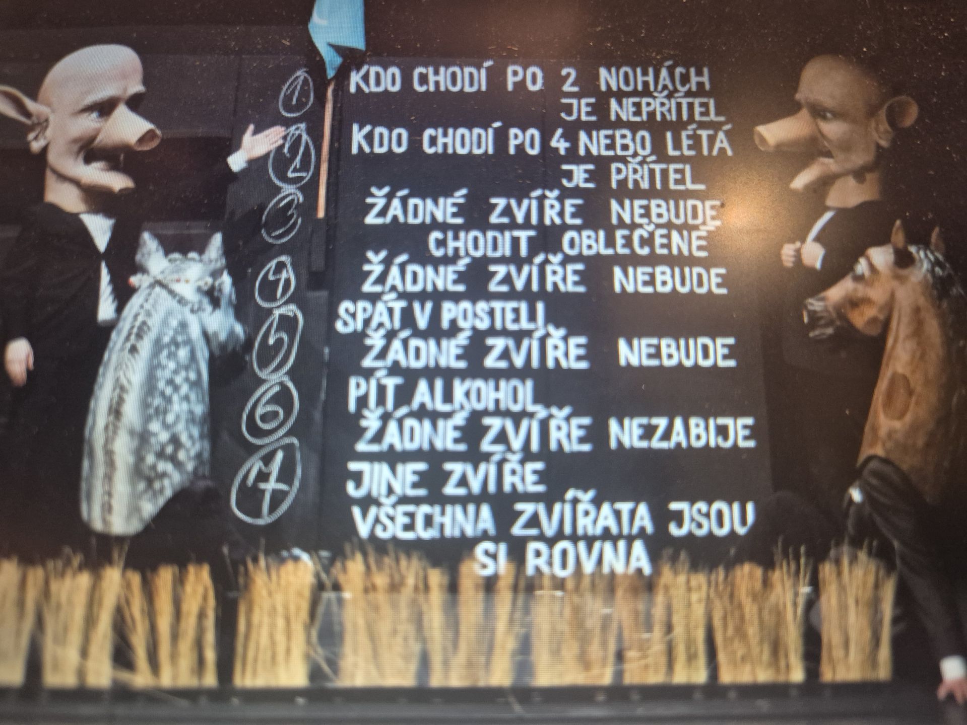Jednalo se o alegorický satirizující román britského autora G. Orwella – Farma zvířat. Jevištní zpracování vyjadřuje totéž, co nám sděluje román.