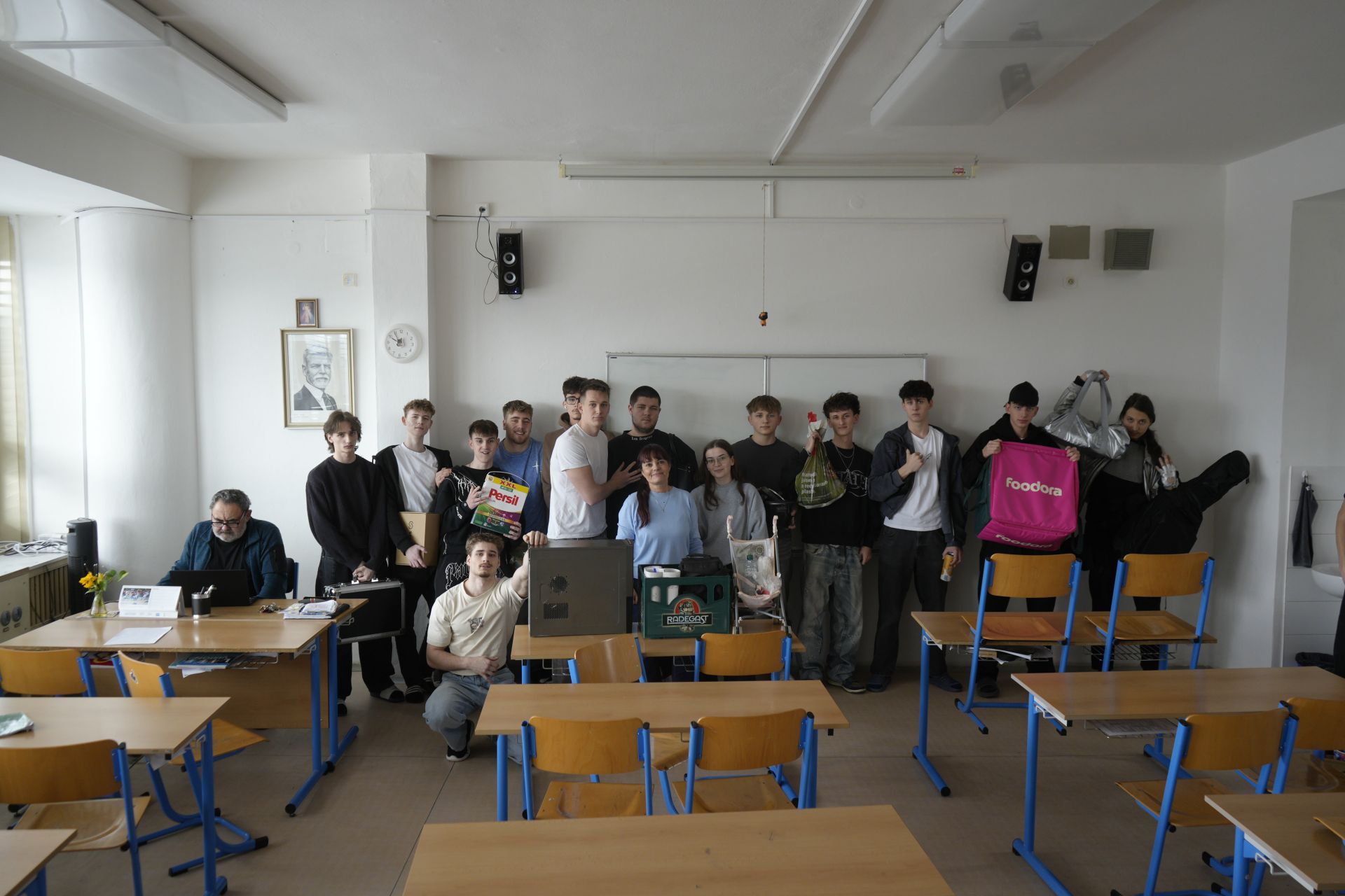 Žáci měli za úkol ponechat batohy doma a pomůcky do školy přinést co možná nejkreativnějším způsobem! Nechyběly květináče, bedny od PC, basy od piva (prázdné!) ani jiné kurozity! Žáci si toto netradiční obzvláštnění výuky velice užili.