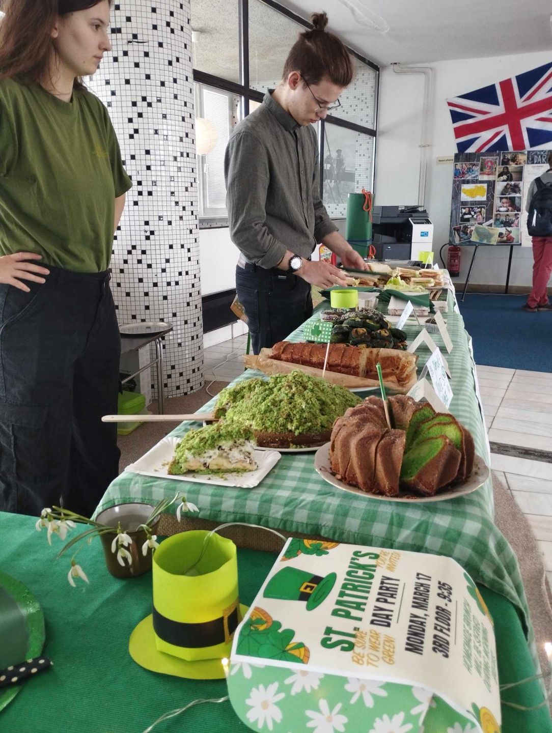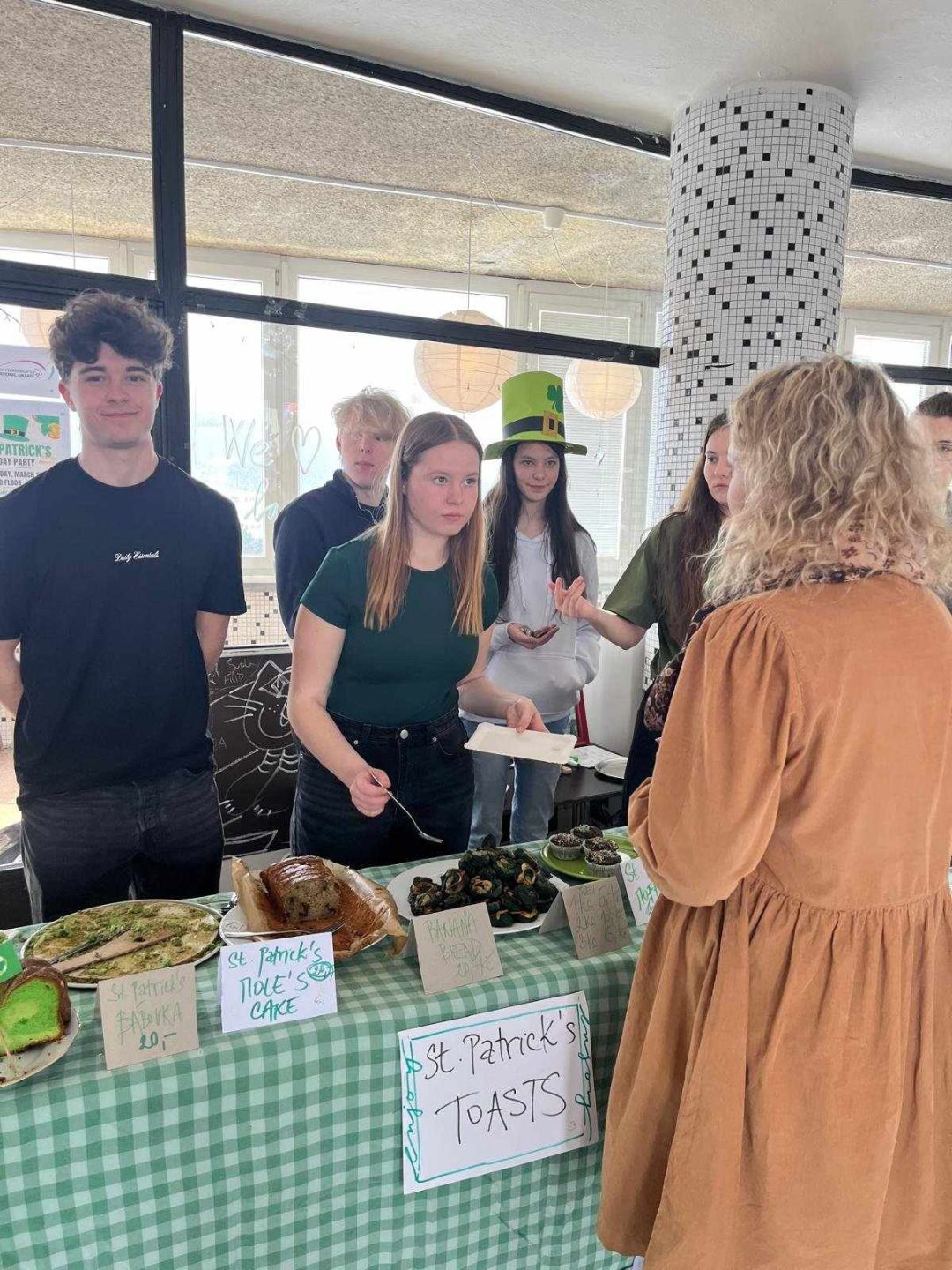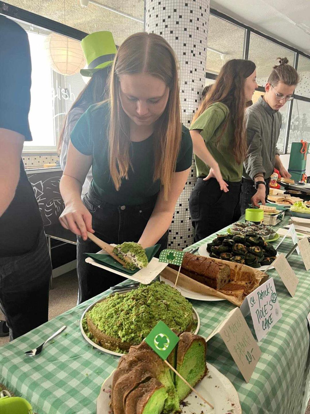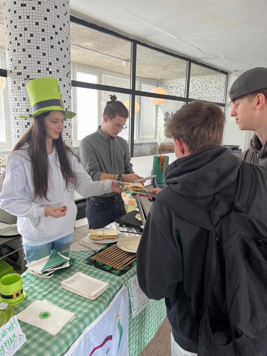 Studenti si připravili pestrou nabídku zelených dobrot – nechyběl zelený krtkův dort, zelená bábovka, zelení šneci, skvělý banánový chlebíček, muffiny a mnoho dalších lahůdek včetně toustů se šunkou, sýrem a listem zeleného salátu.
