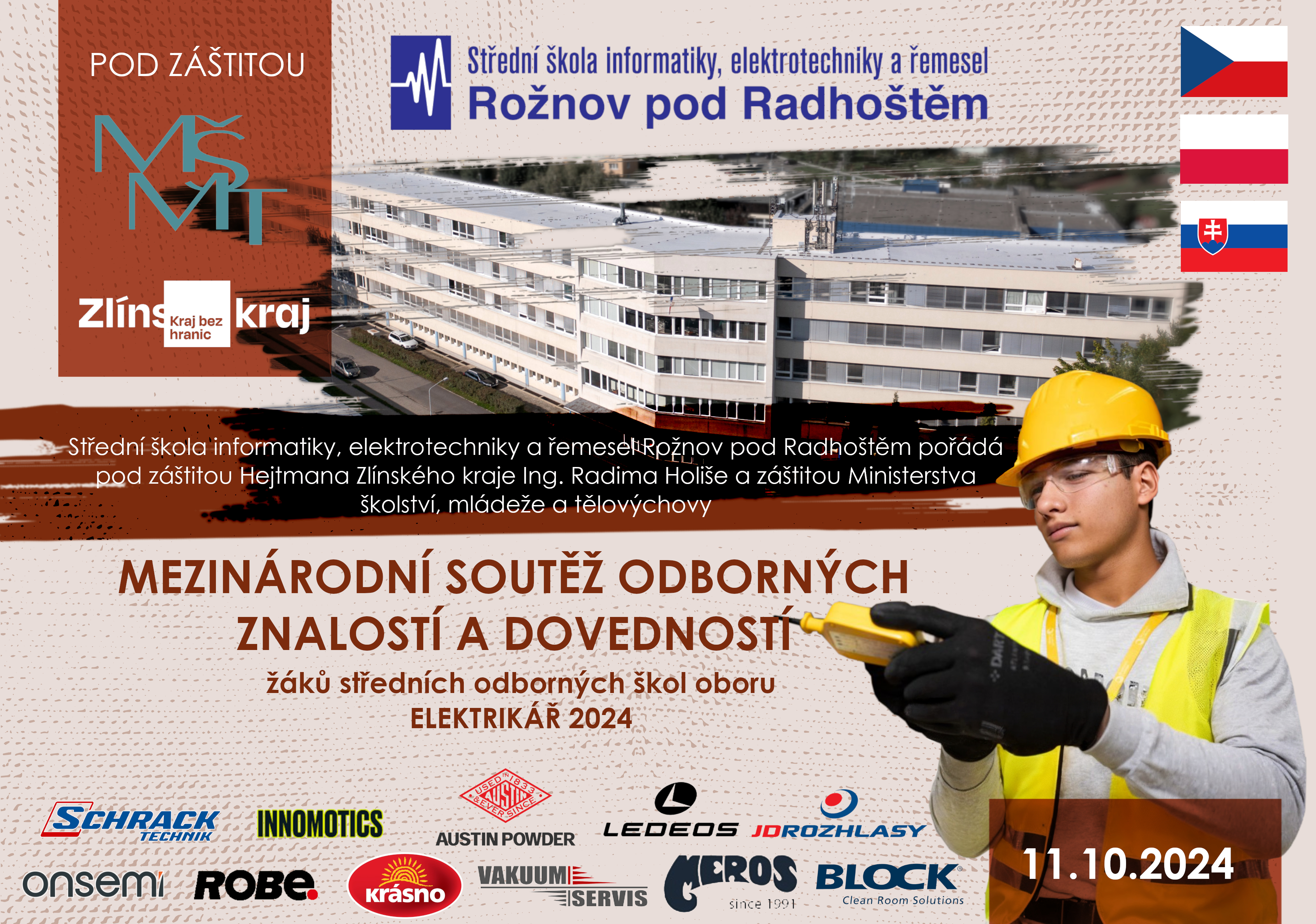 Pořádáme pod záštitou Hejtmana Zlínského kraje Ing. Radima Holiše a záštitou Ministerstva školství, mládeže a tělovýchovy MEZINÁRODNÍ SOUTĚŽ ODBORNÝCH ZNALOSTÍ A DOVEDNOSTÍ žáků středních odborných škol v oboru ELEKTRIKÁŘ. Soutěž se bude konat 11. října 2024.