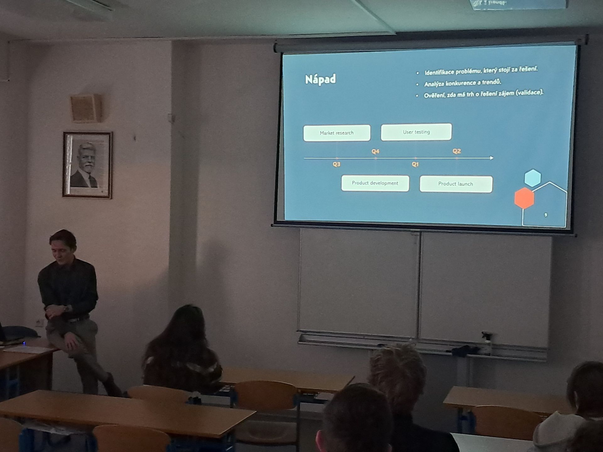 Přednášející se podělil o své osobní zkušenosti, vysvětlil základní pojmy spojené s podnikáním a upozornil na nejčastější chyby, kterých se začínající podnikatelé dopouštějí. Spolužákům také poradil, kde hledat inspiraci, jak si vytvořit jednoduchý podnikatelský plán a proč je důležité nebát se neúspěchu.