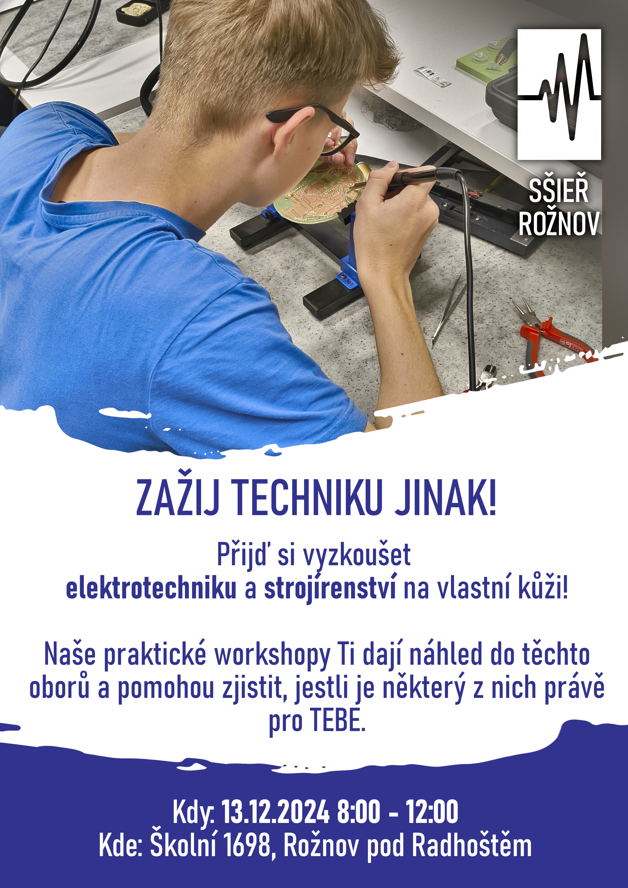 Pro zájemce o obor Mechanik elektronik máme připravený den s názvem Zažij techniku jinak. Bude to dopoledne plné workshopů a práce se zajímavou technikou z elektrotechniky a strojírenství.