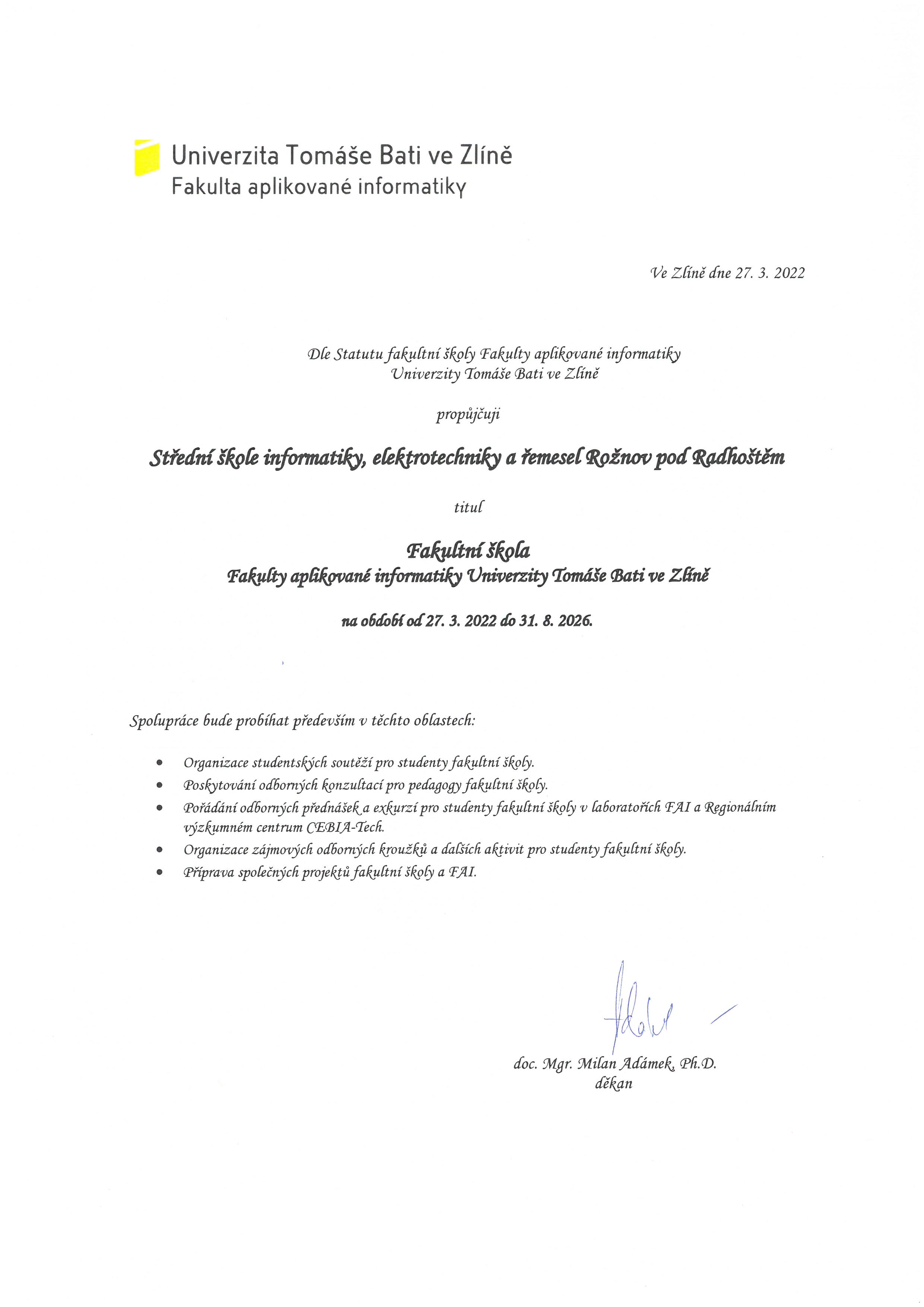 V rámci slavnostního shromáždění došlo k propůjčení titulu fakultní školy těmto středním školám: Střední průmyslová škola Zlín, Střední průmyslová škola strojnická Vsetín, Střední průmyslová škola Přerov, Střední škola informatiky, elektroniky a řemesel Rožnov pod Radhoštěm, Střední průmyslová škola a Obchodní akademie Uherský Brod, Gymnázium Ladislava Jaroše Holešov, Gymnázium Jana Pivečky a Střední odborná škola Slavičín. Zástupci těchto fakultních škol převzali z rukou doc. Adámka pověřovací listiny. Naši školu zastupoval ředitel školy Mgr. Miroslav Trefil. Titul fakultní školy je propůjčen na 5 let, tedy do roku 2026.