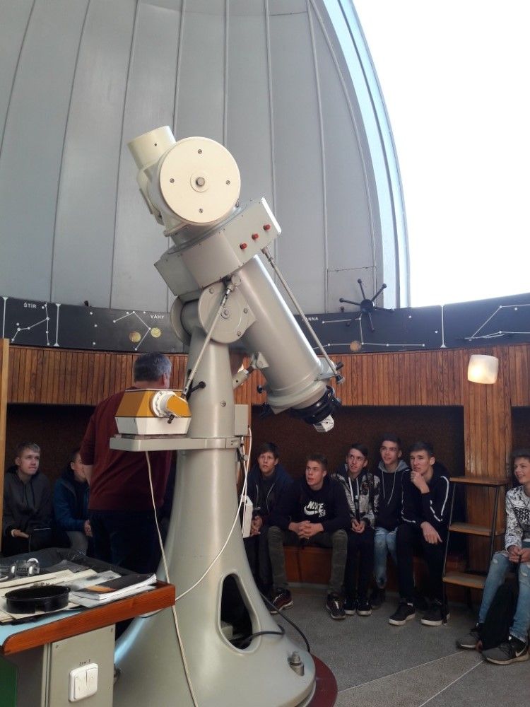 Nejprve žáci absolvovali zajímavou přednášku na téma Vznik a vývoj hvězd, během níž si takzvaně potrápili mozkové buňky při aplikaci matematických a fyzikálních vzorečků, využívaných např. při výpočtu „životnosti“ hvězd, jejich hustoty atd. Následovala komentovaná prohlídka kopule hvězdárny, kde se žáci dozvěděli podnětné informace z oblasti záznamu astronomického pozorování a prohlédli si technické vybavení – CCD kameru, teleskop či menší dalekohledy. V závěrečné části tematické exkurze pak měli žáci možnost pozorovat Slunce, zhlédnout názornou ukázku nastavení teleskopu dle souřadnicového systému a nechyběl ani prostor pro nejrůznější zvídavé dotazy.