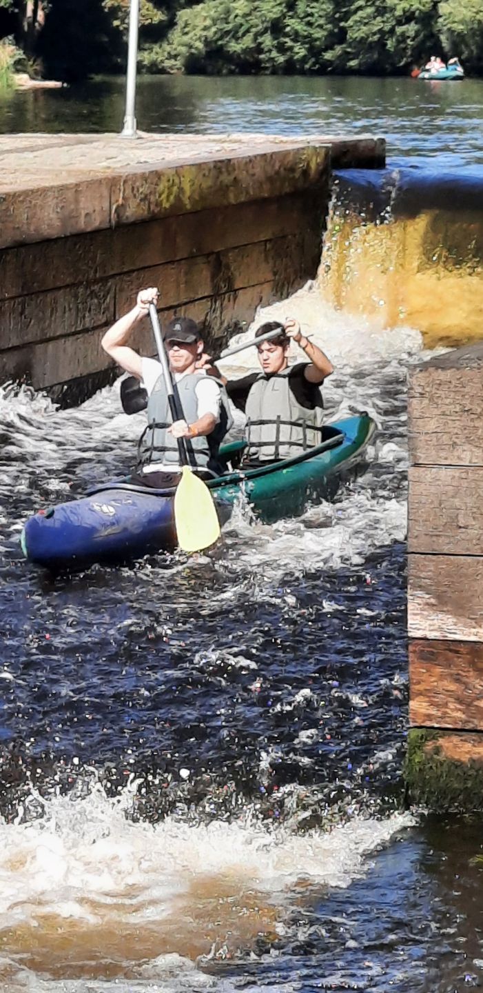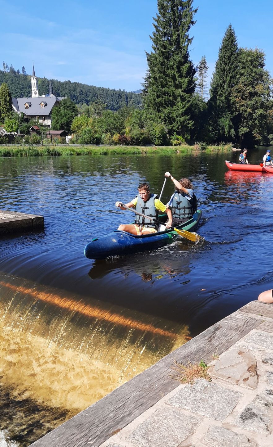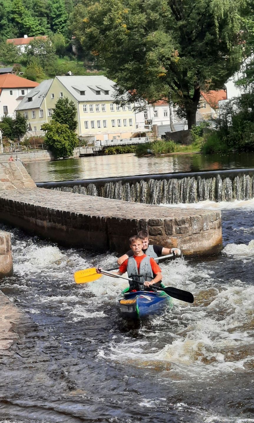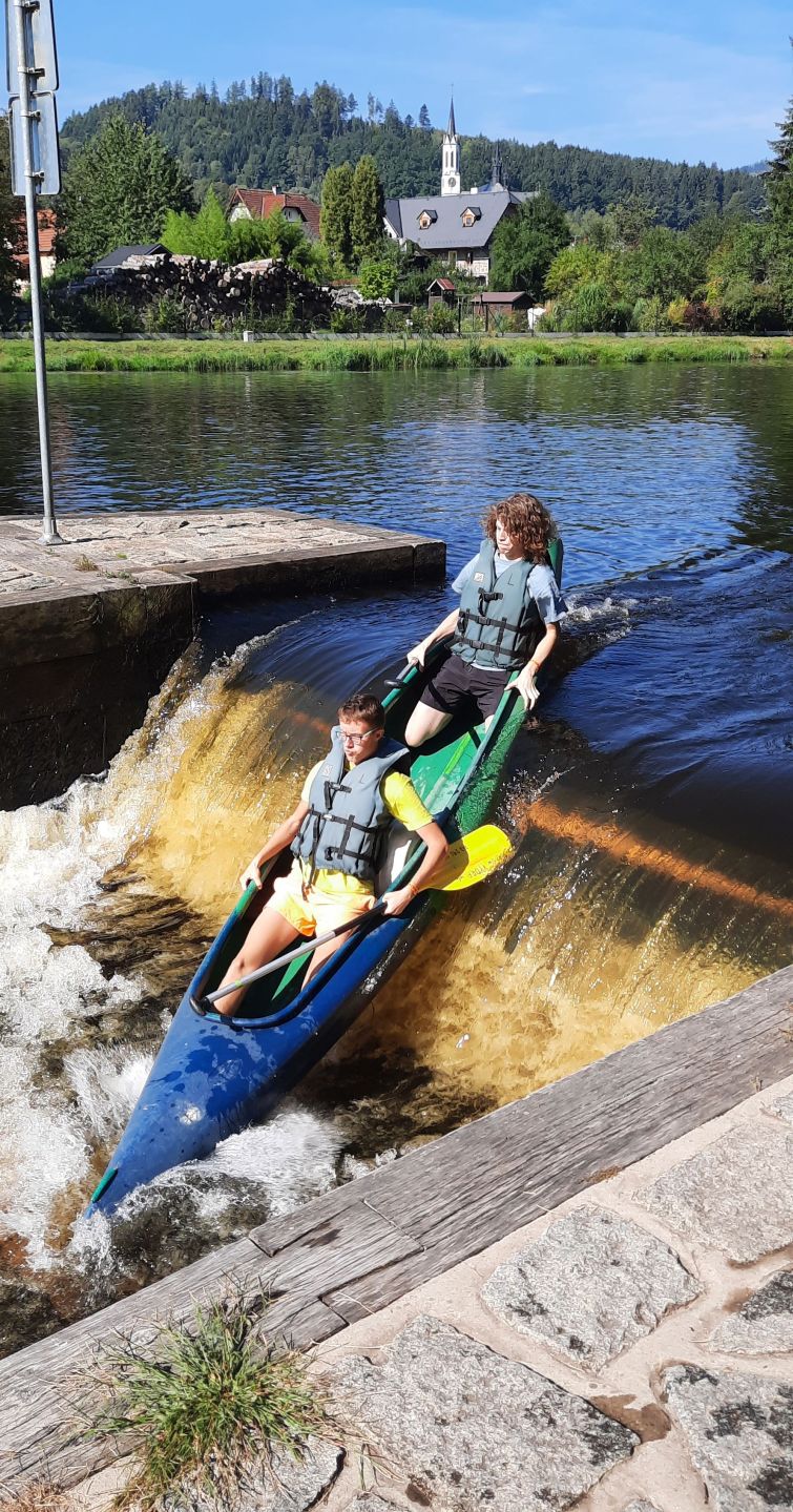 Následující den nás čeká nejdelší etapa z Vyššího Brodu do kempu U Vikinga, přibližně 28 km. Počasí opět ukazuje přívětivou tvář, teplota rychle stoupá a všichni netrpělivě nasedají do lodí s otázkou na rtech - Zvládneme jezy? Některým se první jezy nedaří sjet bezchybně, koupou se. Nevadí. Je teplo a koupání všichni berou s humorem. Do cíle první etapy dojíždí všechny posádky s nadšením a hrdostí, že trasu úspěšně zvládly.