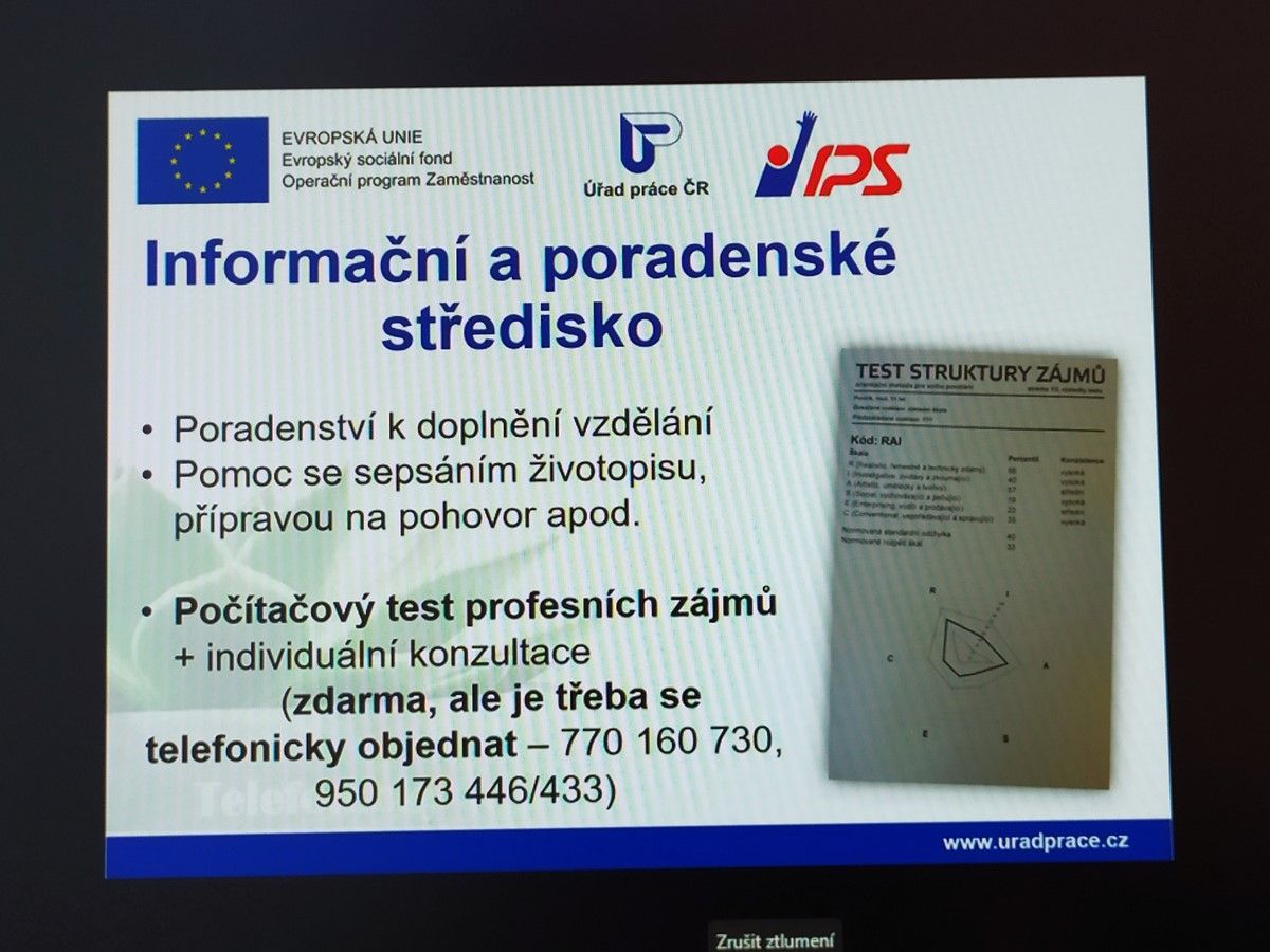 Přednáška na téma „Kam po maturitě“ přinesla žákům řadu nových informací, které jim pomohou při hledání možností dalšího profesního směřování. Stručnou, ale především pochopitelnou formou byli seznámeni s možnostmi, kam dál po ukončení školy, včetně statistik nezaměstnanosti a volných pracovních míst v našem okrese.