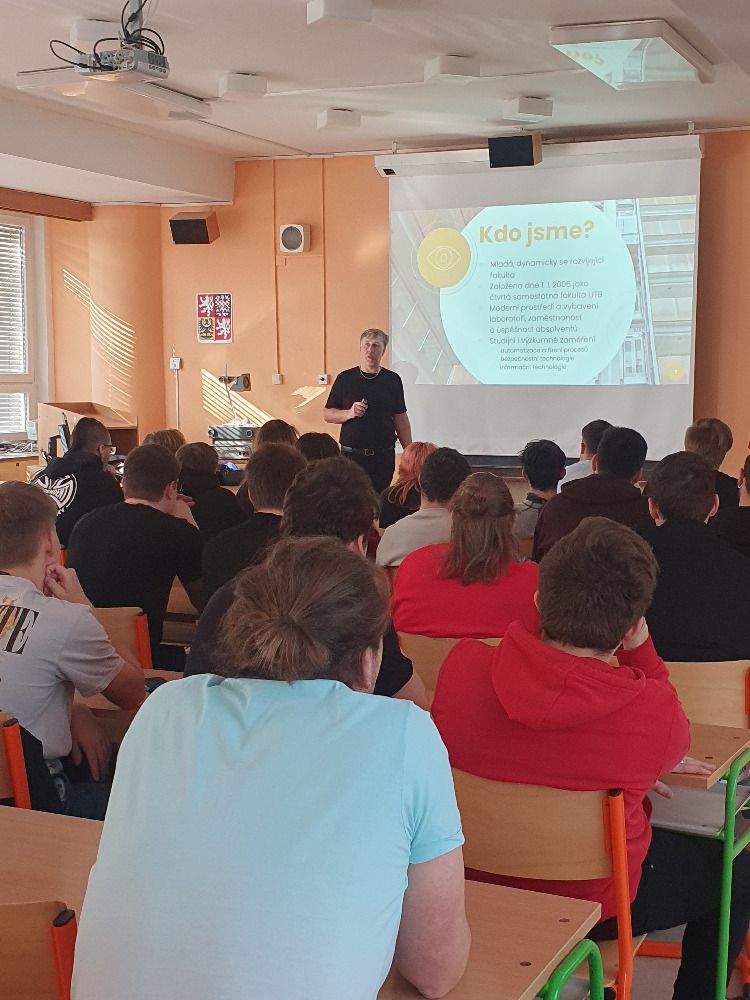 Rádi jsme přivítali vyučujícího z Fakulty aplikované informatiky UTB Zlín. Představení jednotlivých oborů FAI bylo jistě pro naše maturanty užitečné. Studenti naší školy již mohli absolvovat veletrh pomaturitního studia Gaudeamus v Brně či bezplatné kariérní testy v rámci našeho školního poradenského pracoviště. Aktuálně probíhají na jednotlivých VŠ tzv. dny otevřených dveří, což je další příležitost – jak si vybrat správně!