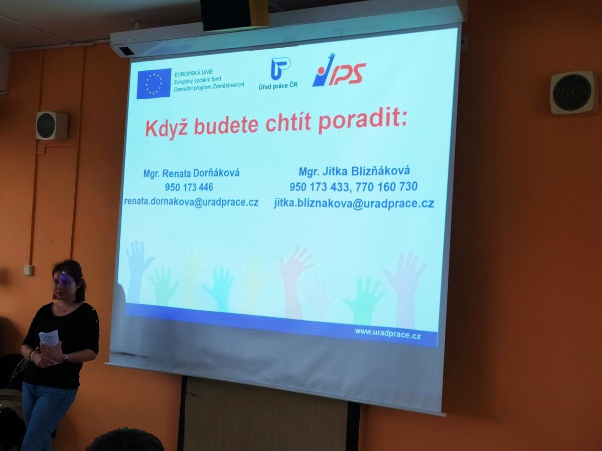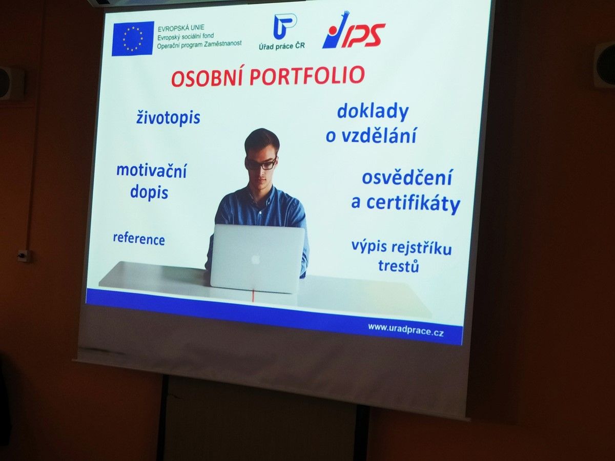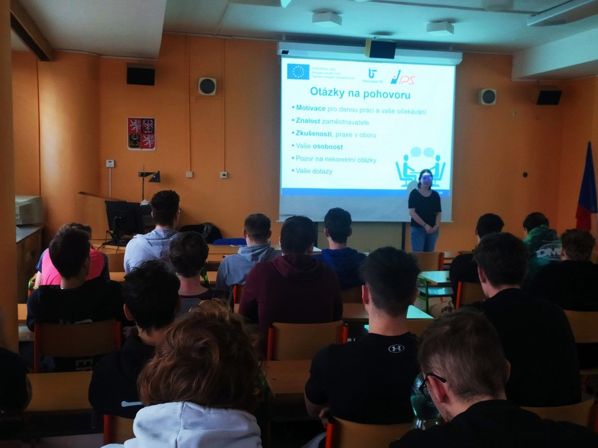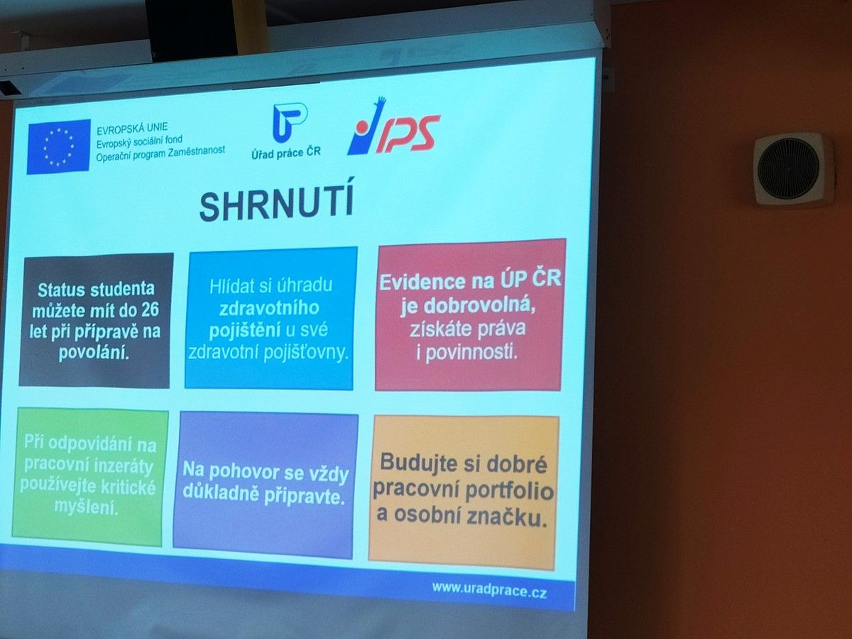 Beseda byla určena žákům třetích ročníků maturitních oborů. Žákům byly poskytnuty základní informace o možnostech zaměstnání (ČR, zahraničí), pokračování ve studiu nebo založení vlastní firmy. Pod úřadem práce funguje Informační a poradenské středisko pro volbu a změnu povolání (IPS), které poskytuje bezplatné služby (uplatnitelnost vzdělání na trhu práce, test k volbě povolání, motivační dopis, životopis, stáže, studium, pobyty v zahraničí, příprava na vstup na trh práce atd.) pro absolventy různých škol. V rámci besedy se žáci dozvěděli mnoho užitečných informací, zúčastnili se workshopu (osobnostní test, přijímací pohovor). Byly jim poskytnuty rady a doporučení, jak postupovat, jestliže se ocitnou v situaci, kdy se kariéra nevyvíjí podle jejich představ. Byly zdůrazněny především časté chyby, kterých se absolventi dopouští, například v situaci, kdy odejdou pracovat do zahraničí. Žáci se také dozvěděli, do kdy mají status studenta a jaké výhody z toho plynou. Každý žák dostal informativní leták s kontakty na poradce IPS a odkazy na webové stránky týkající se této problematiky.