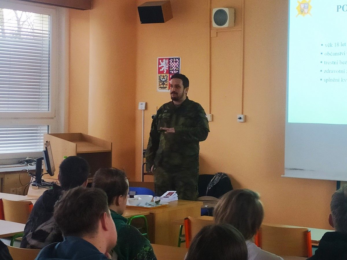 Přednáška byla doplněna o prezentaci prap. Romana Prachaře z vojenského rekrutačního pracoviště Zlín o možnostech pracovního uplatnění v armádě.